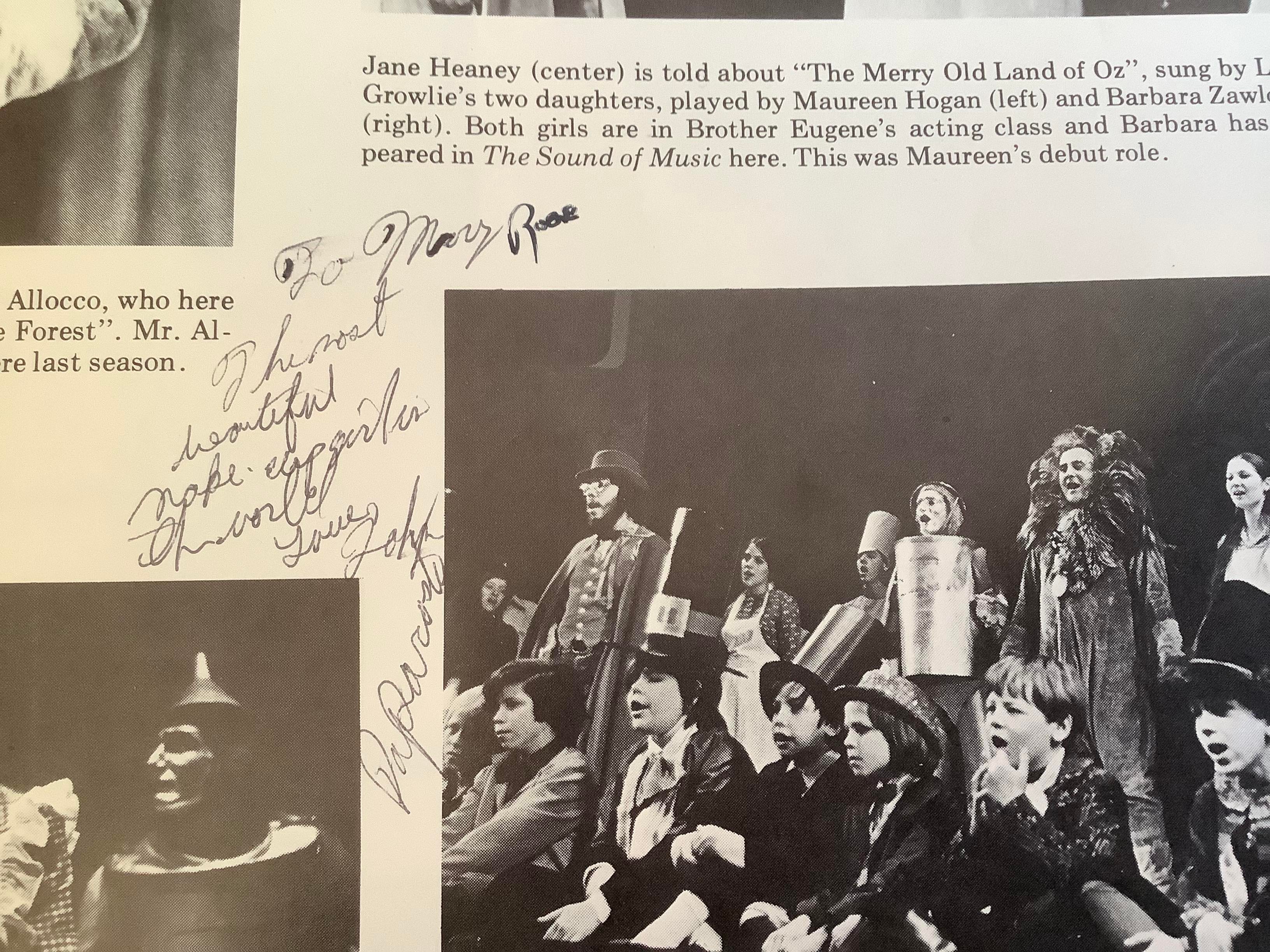 What a kind thing to do – to send me these notes and pictures. Here is one. My brother is in the bottom row, second from the left. His good friend Chris is partially pictured at the extreme left. My brother’s inscription reads: “To Mary Rose, the most beautiful makeup girl in the world.” In her note to me, Mary Rose said she so enjoyed applying and removing my brother’s stage makeup for The Wizard of Oz production because Pepo made her laugh so much. She added that he probably has the heavenly angels in stitches.